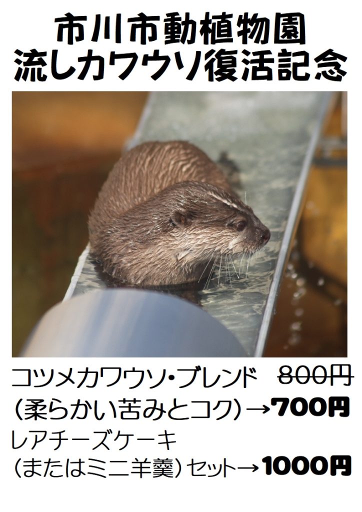 2025年8月9日 / 最終更新日時 : 2025年8月9日 cafe-lutra マスター お知らせ 流しカワウソ復活記念 ツツジによる流しカワウソの復活記念という事で、コツメカワウソブレンド並びにケーキ(またはミニ羊羹)セットを割引価格で提供します。この機会に是非ご賞味下さい。