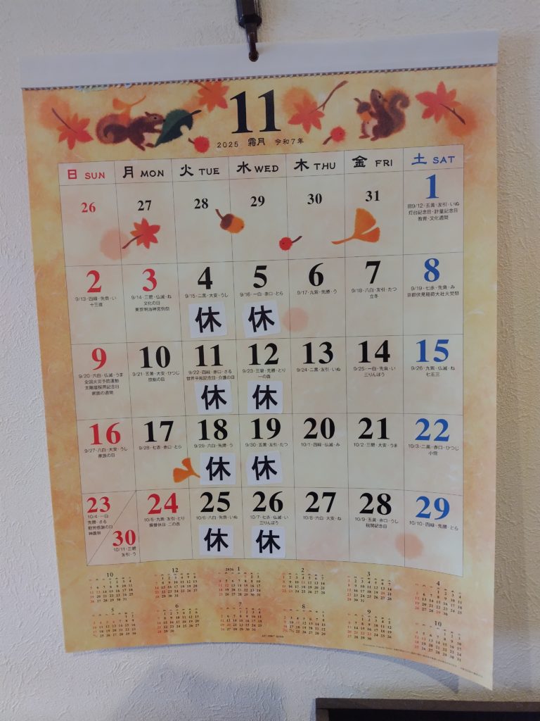 2025年11月1日 / 最終更新日時 : 2025年11月1日 cafe-lutra マスター お知らせ 11月の休みは 11月の休みは、4日(火)、5日(水)、11日(火)、12日(水)、18日(火)、19日(水)、25日(火)、26日(水)です。通院等による臨時休業もしくは時短営業があるかもしれません。
