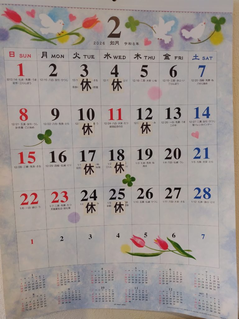 2026年2月5日 / 最終更新日時 : 2026年2月5日 cafe-lutra マスター お知らせ 2月の休みは 遅くなりましたが、2月の休みです。11日(水)は営業し、代わりに12日(木)をお休みします。